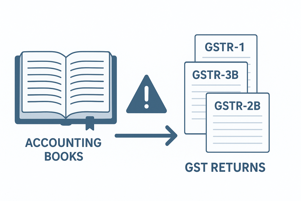 One of the most common (and dangerous) red flags is when your accounting books don’t match your GST returns — especially GSTR-1, GSTR-3B, and GSTR-2A/2B.